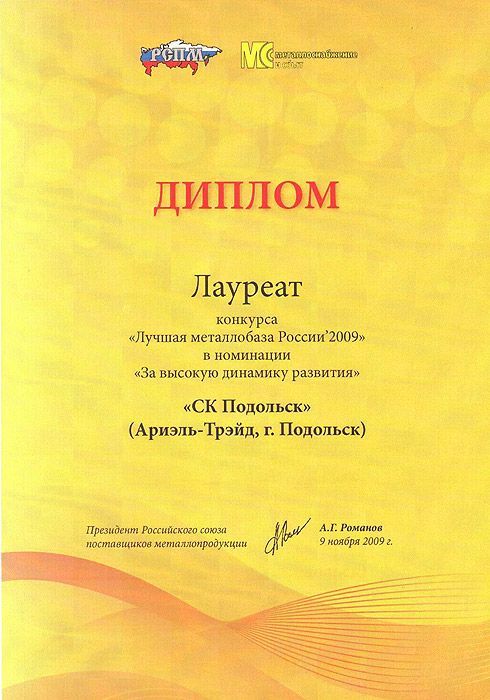 Лучшая металлобаза России’2009 «За высокую динамику развития» СК «Подольск» 9 ноября, Москва